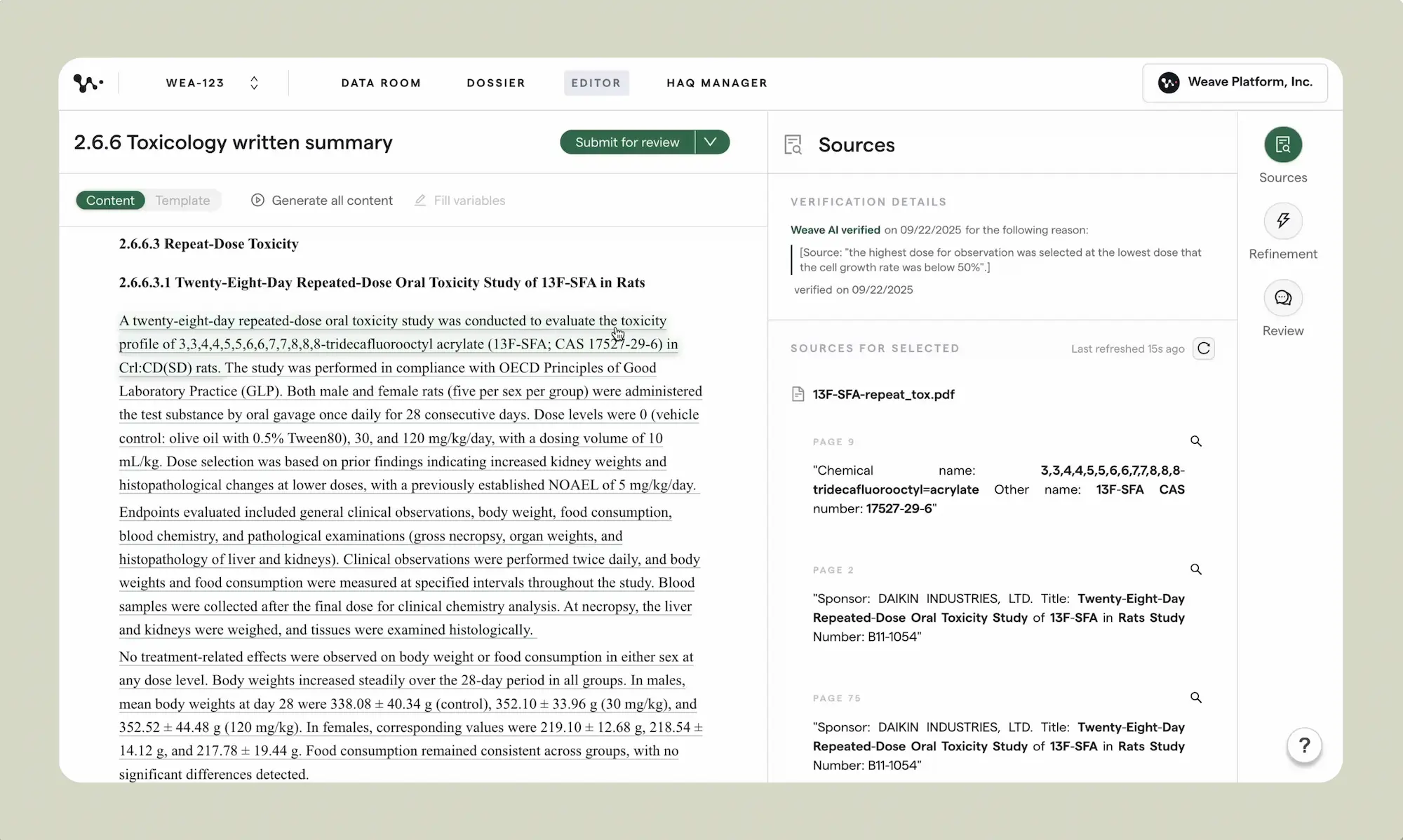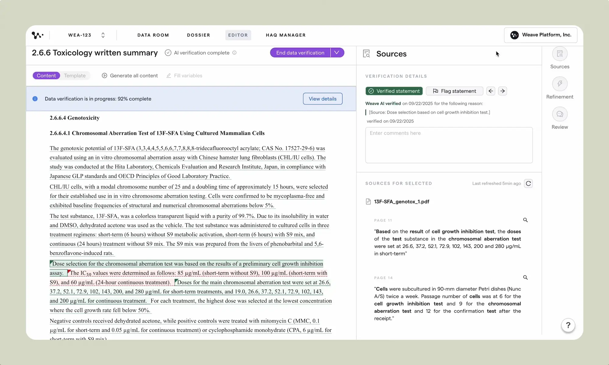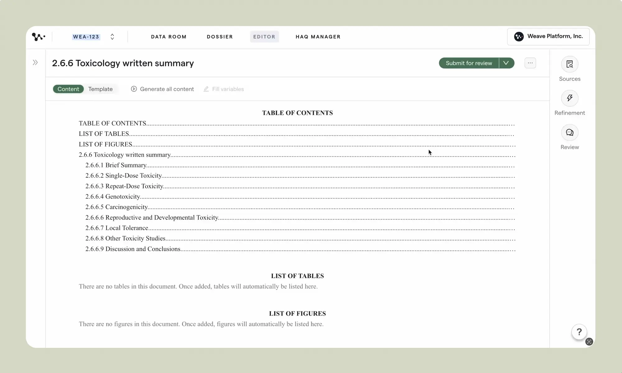 With Weave, you’re the one in charge, orchestrating the final draft to perfection, while standard text, tables and figures just get done. Now, instead of doing, you’re directing—solving problems and shaping narratives in real-time across your entire organization.